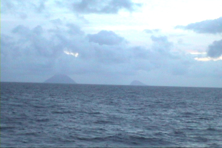 、「としま」が引く航跡の向こうに、奄美大島が見えている。