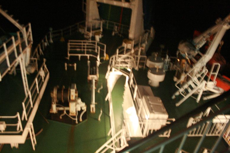 フェリー「としま」は絶海の孤島の闇を背景に、通路や窓の明かりで