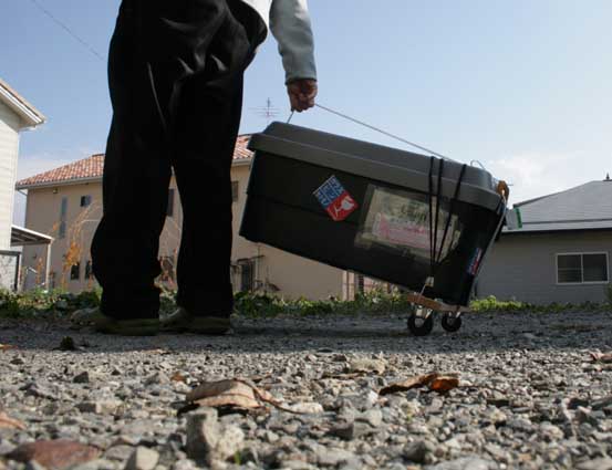 犬の散歩みたいに引いて歩きます。 こんな砂利道も平気です。