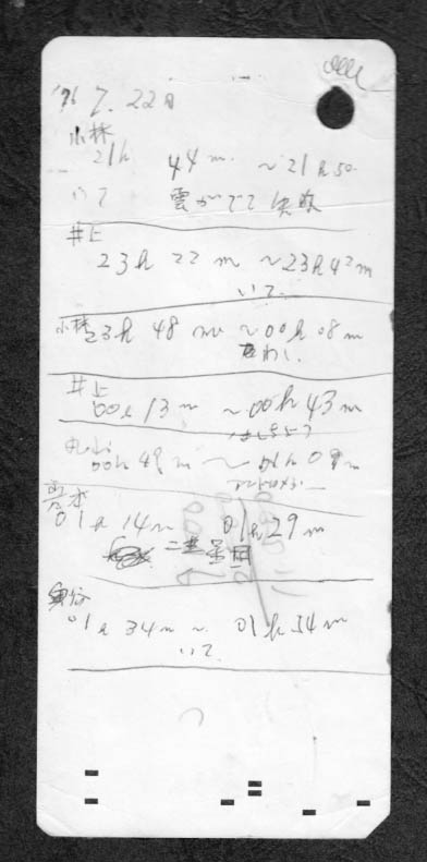 それはそれでよかったのであるが、2日目からが大変であった。2日目、私と井上氏は何と望遠鏡をドロボーから守るために外で寝ることにした。朝3時ごろ、私は顔に吹き付ける風雨で目を覚まし、井上氏といっしょに荷物を風雨から守るべく手段をとった。望遠鏡だけは井上氏の野性的なカンにより前日から風雨のあたらぬ場所においてあったのでぬれずにすんだようだ。我々にとって命の次にだいじな望遠鏡(?)をぬらさなかったのは、さすがである。そうこうしているうちに夜が明け、テントの連中をおこして飯をつくった。飯については、ほぼPerfectにできたようだ。量的にも質的にも一応非のつけどころがなく(??)うまくできた。(編集者註1)